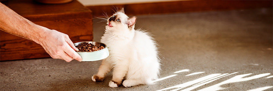 En kattunge behöver äta näringsrikt foder anpassat för kattungar. När du hämtar hem din kattunge (som ska vara minst 12 veckor) är den vanligtvis van vid att äta torrfoder, färskfoder eller blötmat för kattungar. Det är vanligt att uppfödaren skickar med det foder som kattungen är van vid. Även om du vill byta foder till din kattunge är det bra om den får äta maten den är van vid under några veckor efter flytten. Det är stressfullt att byta hem och då är det bra för kattungens mage att få det den är van vid innan du gör en successiv övergång till det nya fodret.