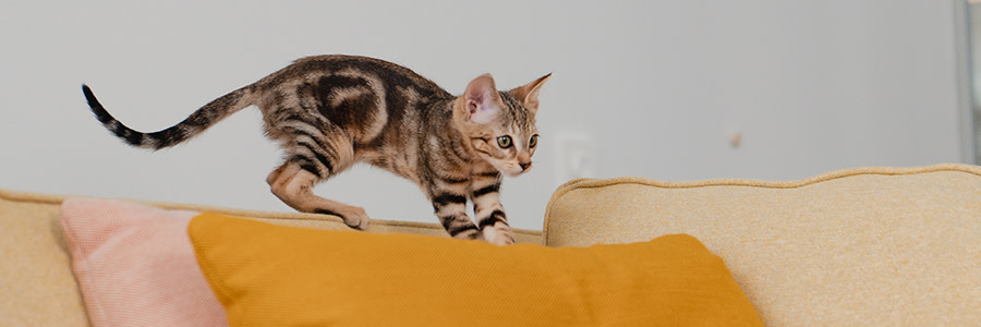 Det är även vanligt att kattungen börja klösa på möbler, och soffan är ofta ett favoritmål. Klösandet är ett instinktivt beteende som hjälper katten att markera revir, sträcka ut kroppen och hålla klorna i gott skick. Ett klösträd med flera nivåer är ett bra val, eftersom det inte bara ger en plats att klösa på utan också erbjuder höga utkiksplatser som kan minska behovet av att hoppa upp på exempelvis bord och diskbänk. Tänk på att du kan behöva uppgradera klösträdet eller ändra dess placering allt eftersom kattungen växer. Katter vill kunna sträcka ut kroppen ordentligt när den vässar sina klor - det blir som en stund av stretchning samtidigt som klorna blir vassare. Då är det viktigt att klösbrädan eller klösträdet möjliggör det beteendet.