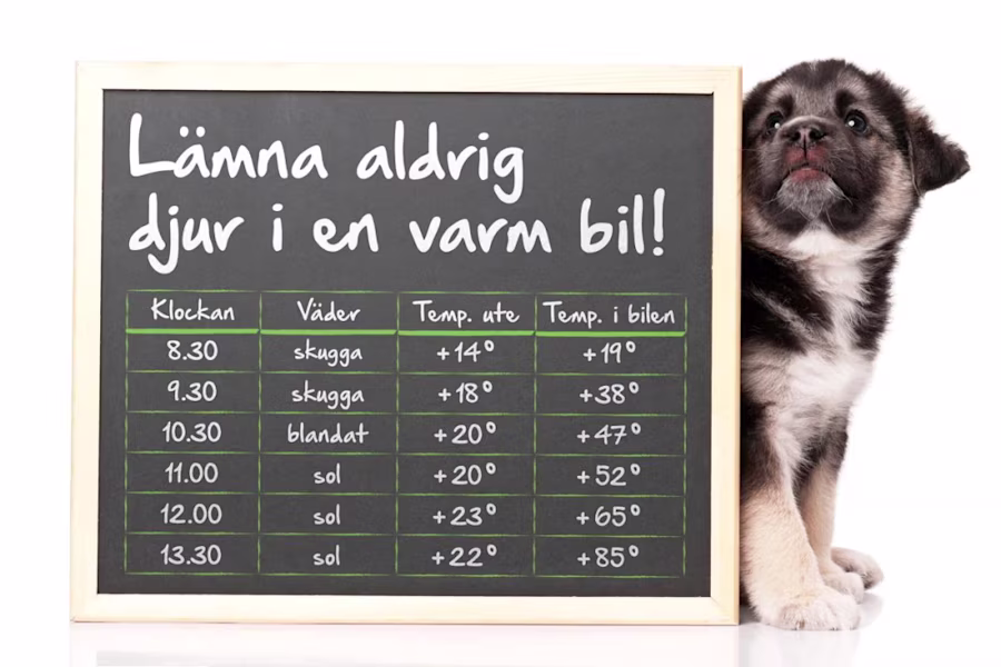 Varje år dör hundar som lämnats i varma bilar. På bara några minuter kan temperaturen i en bil stiga snabbt till +50 grader om det är sol ute. Att lämna bilfönstren på glänt ger dessutom inte tillräckligt med ventilation för att sänka temperaturen i bilen. Grundregeln är därför att aldrig lämna ett djur i bilen på sommaren, inte ens om den står i skugga – solen rör sig och även en skuggig plats blir snabbt för varm!